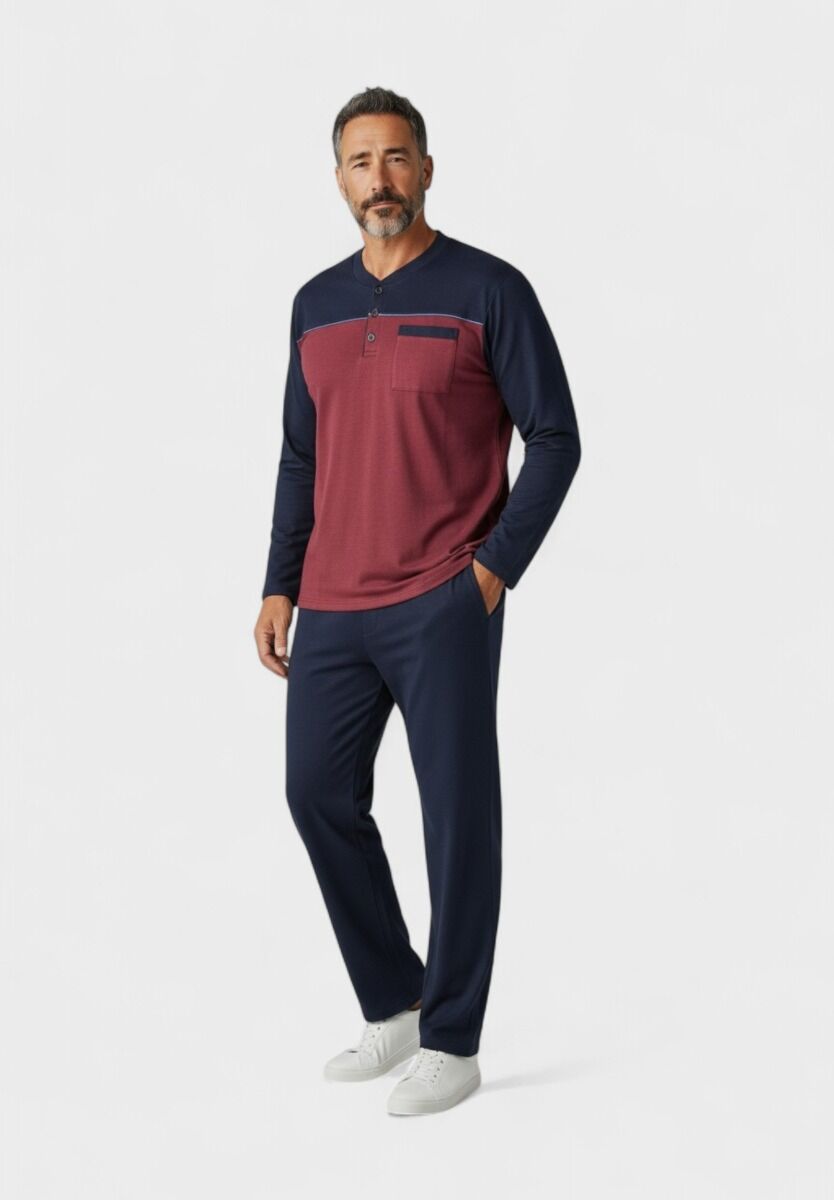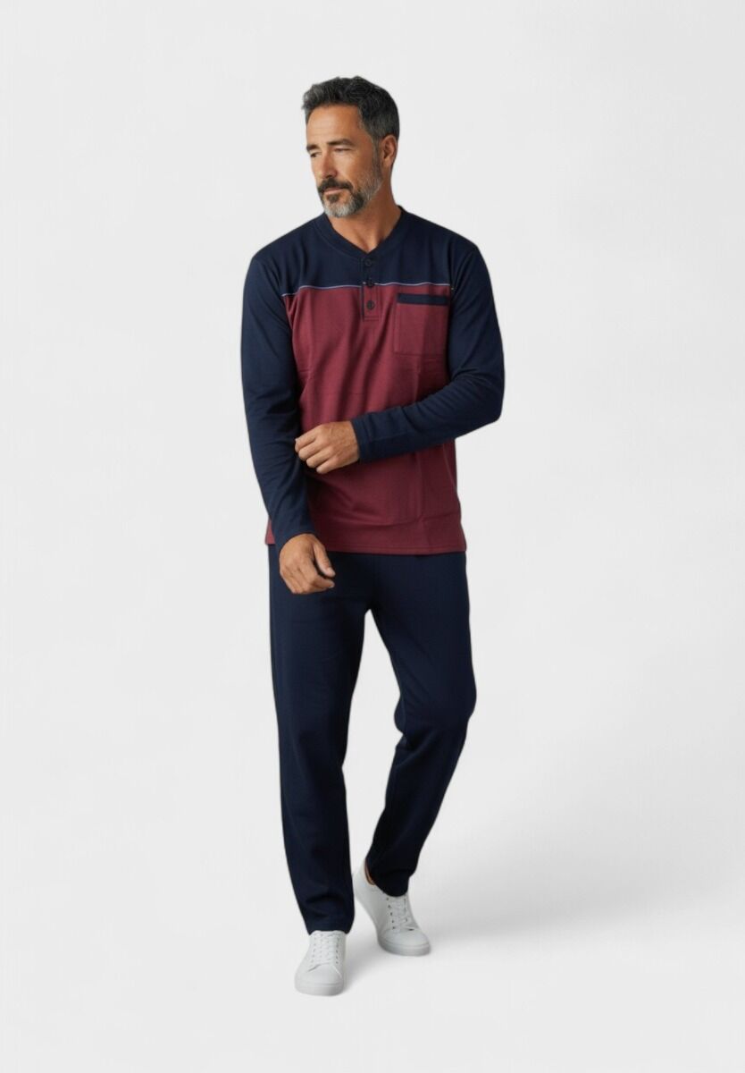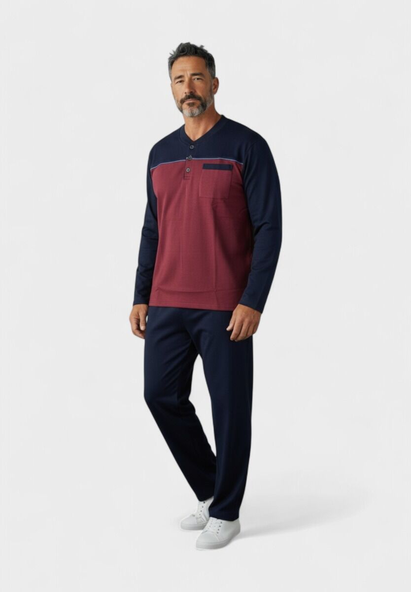 Ανακάλυψε την άνεση και το στυλ που σου αξίζει με την ανδρική πιτζάμα φούτερ Collection σε διχρωμία μπορντό και μπλε. Κατασκευασμένη από 70% βαμβάκι και 30% πολυεστέρα, προσφέρει απαλότητα, ζεστασιά και ελευθερία κινήσεων, ιδανική για τους κρύους μήνες.