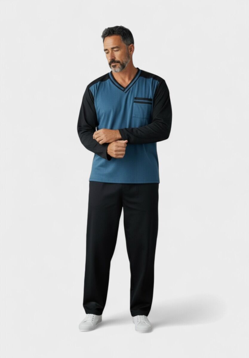 Ανακάλυψε την απόλυτη άνεση με την ανδρική πιτζάμα Fleece Collection σε μπλε και μαύρη απόχρωση. Κατασκευασμένη από 70% βαμβάκι και 30% πολυεστέρα, προσφέρει ζεστασιά και απαλότητα για τις κρύες νύχτες του χειμώνα. Το πάνω μέρος διαθέτει μοντέρνο V λαιμό, τσέπη στο στήθος και αντίθεση χρωμάτων στα μανίκια και στους ώμους, προσδίδοντας κομψό και σύγχρονο look. Το παντελόνι είναι μονόχρωμο, με άνετη γραμμή και ελαστική μέση για τέλεια εφαρμογή.