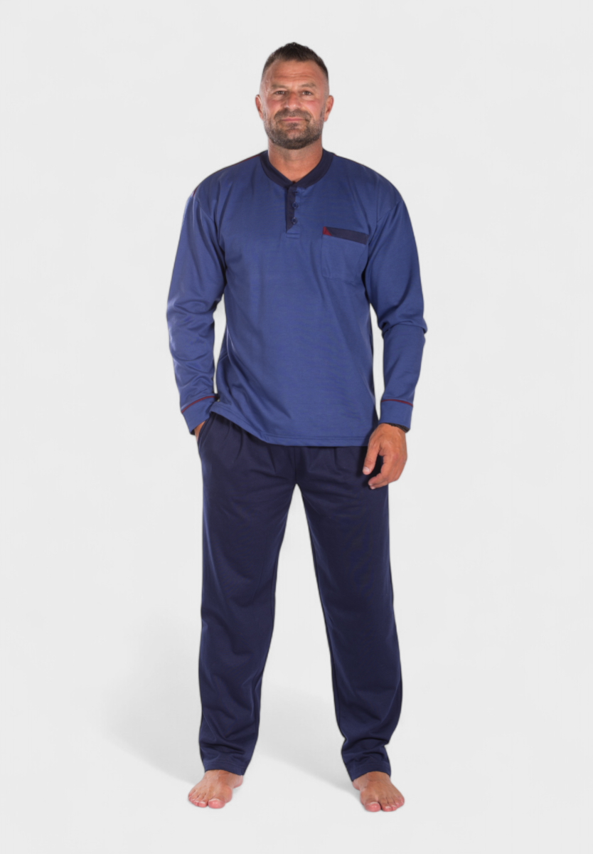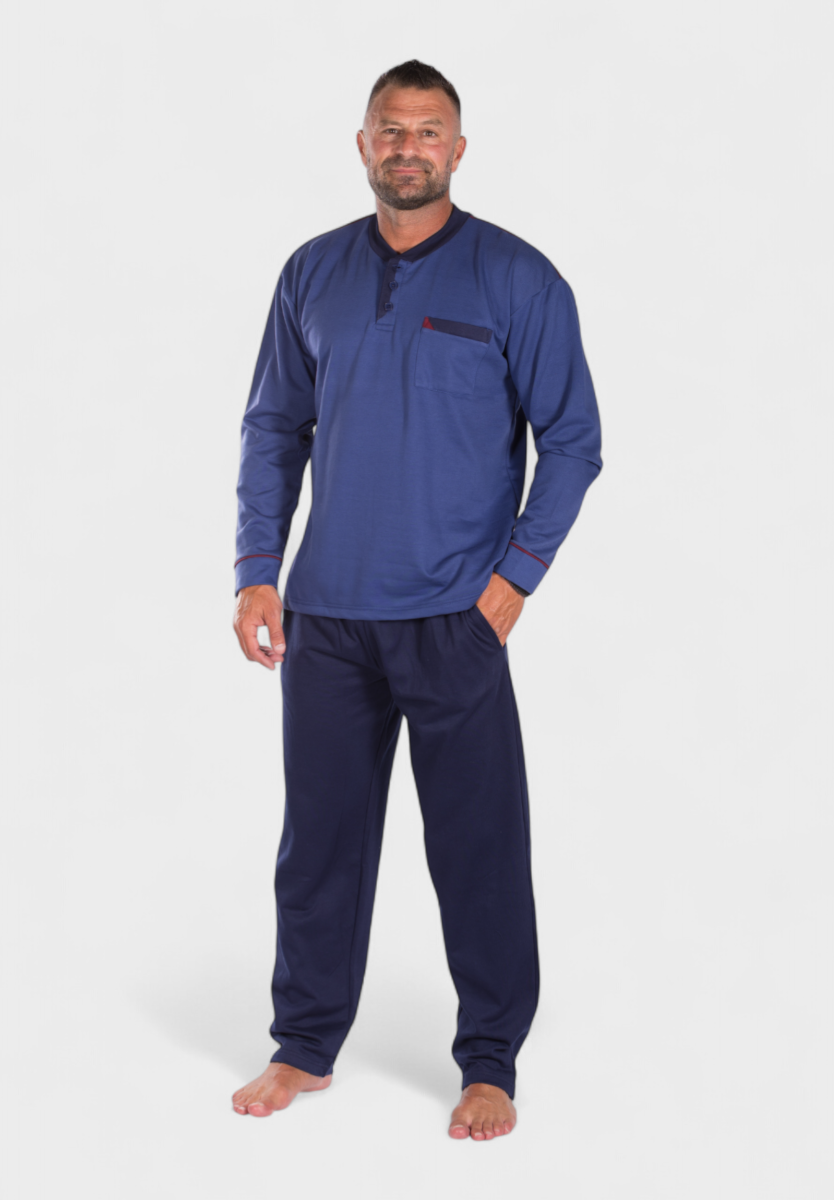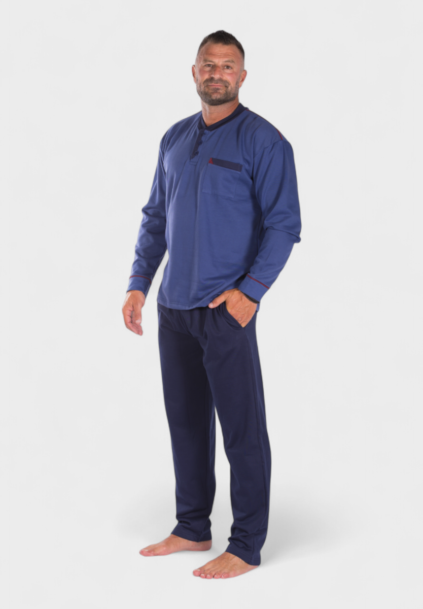 Η μπλούζα διαθέτει κομψή πατιλέτα με κουμπάκια στο στήθος καθώς και πλευρική τσέπη, ενώ το παντελόνι περιλαμβάνει πλαϊνές τσέπες, ιδανικές για καθημερινή χρήση. Η σύνθεση από 70% βαμβάκι και 30% πολυεστέρα προσφέρει ζεστασιά, αντοχή και ευχάριστη υφή στο δέρμα.