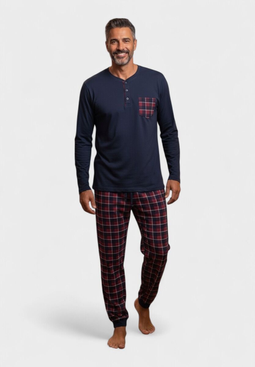 Ανδρική βαμβακερή πιτζάμα Interlock Collection με κλασικό καρό σχέδιο. Η μακρυμάνικη μπλούζα σε σκούρο μπλε χρώμα διαθέτει στρογγυλή λαιμόκοψη με κουμπιά (henley style) και τσεπάκι σε κόκκινο-μπλε καρό για stylish λεπτομέρεια. Το παντελόνι με ίσιο κόψιμο και καρό μοτίβο ολοκληρώνει το σετ, προσφέροντας διαχρονικό χαρακτήρα και άνεση. Κατασκευασμένη από 100% βαμβάκι interlock, εγγυάται απαλότητα, φυσική διαπνοή και αντοχή. Ιδανική επιλογή για τον άνδρα που θέλει να ξεχωρίζει ακόμα και στις στιγμές χαλάρωσης.