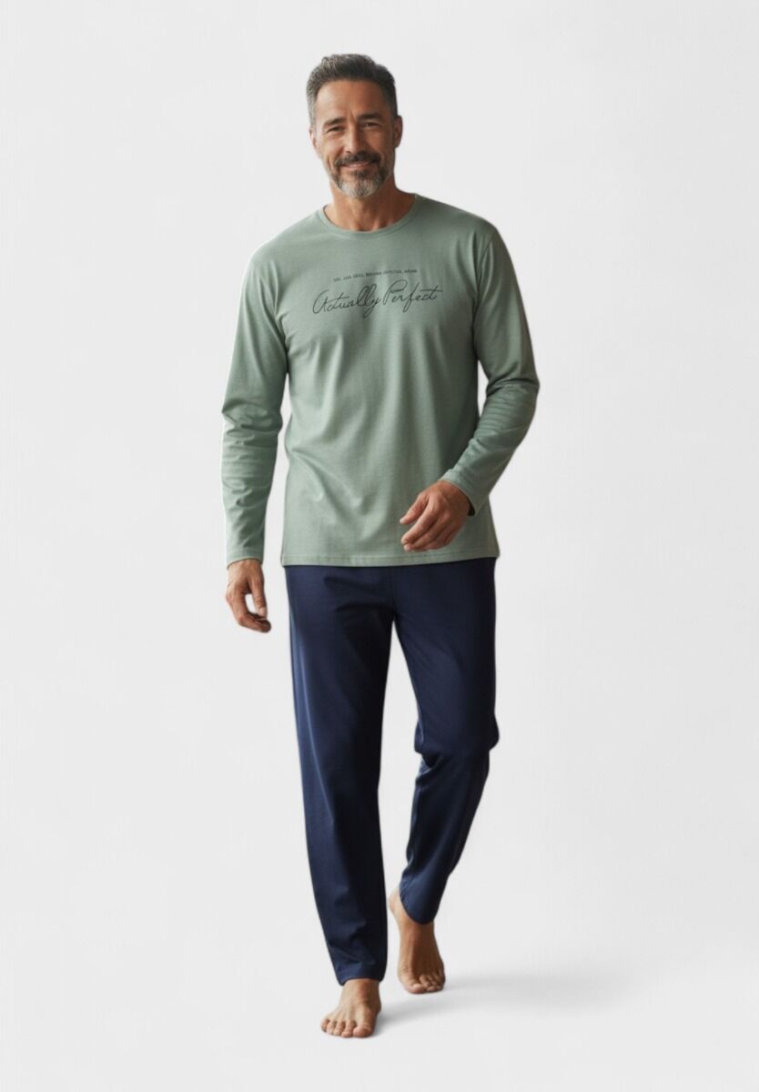Ανακάλυψε την ανδρική βαμβακερή πιτζάμα Interlock Collection, φτιαγμένη από 100% αγνό βαμβάκι για απόλυτη άνεση και διαχρονικό στυλ. Η μπλούζα σε πράσινη απόχρωση με διακριτικό τύπωμα συνδυάζεται ιδανικά με το σκούρο παντελόνι, δημιουργώντας ένα look που αποπνέει κομψότητα ακόμα και στις πιο χαλαρές στιγμές.