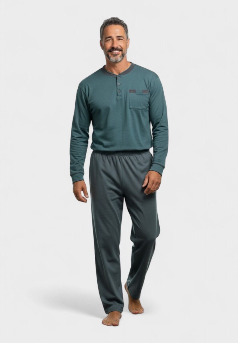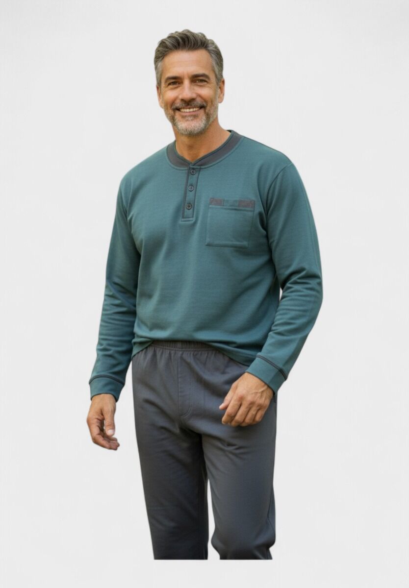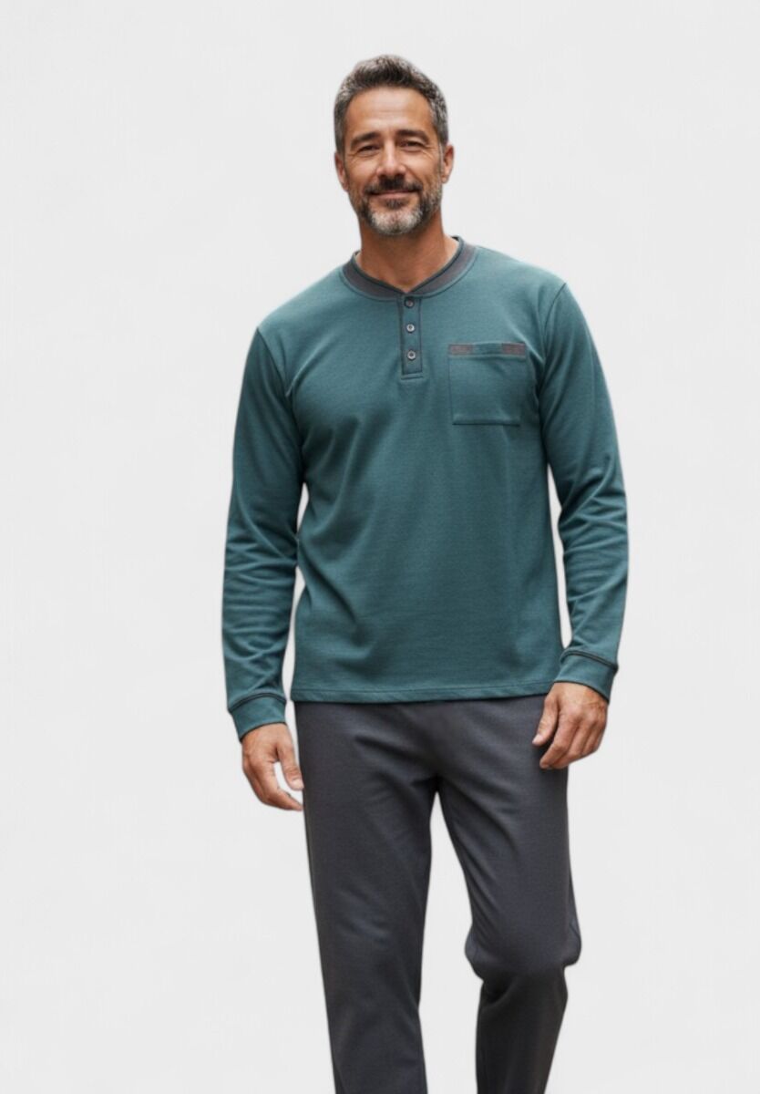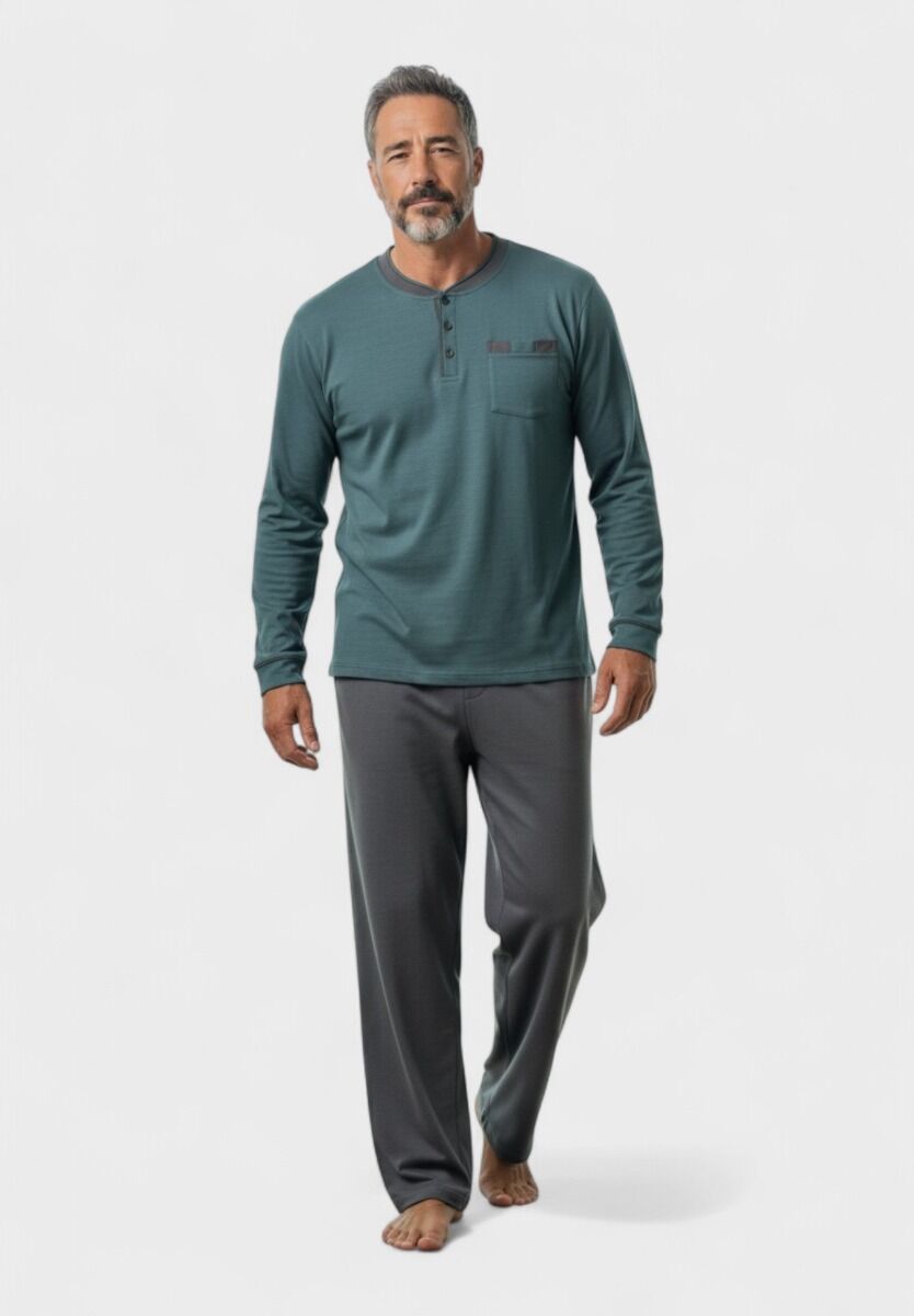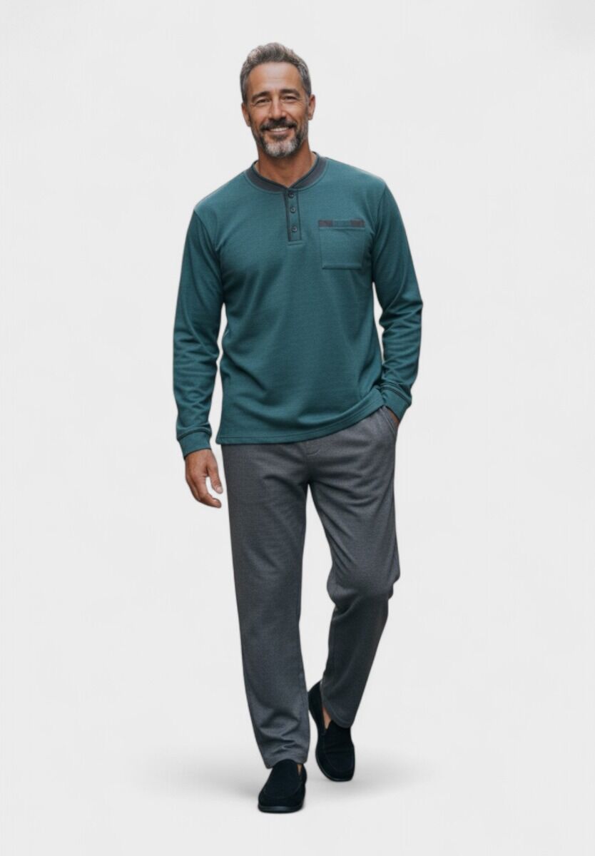 Το σετ περιλαμβάνει μπλούζα με μακρύ μανίκι σε πετρόλ απόχρωση με κουμπιά στο λαιμό και διακριτικές λεπτομέρειες στη τσέπη, συνδυασμένη με άνετο παντελόνι σε σκούρο γκρι. Μια κλασική αλλά μοντέρνα επιλογή που συνδυάζει κομψότητα και άνεση για τον άνδρα που προσέχει ακόμα και το homewear του.