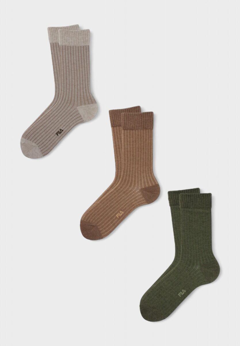 Το πακέτο 3 τεμαχίων περιλαμβάνει κάλτσες σε αποχρώσεις μπεζ, καφέ και χακί, ιδανικές για minimal ή casual εμφανίσεις.