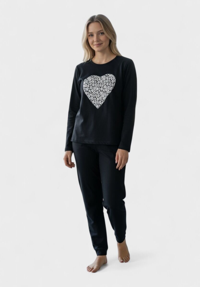 Η γυναικεία βαμβακερή πιτζάμα Cherry Underwear Heartbeat Cozy είναι η τέλεια επιλογή για άνεση και στυλ στα πιο χαλαρά βράδια σου. Το μαύρο top με το εντυπωσιακό λευκό μοτίβο καρδιάς στο κέντρο δίνει έναν παιχνιδιάρικο και ρομαντικό χαρακτήρα, ενώ το μαύρο παντελόνι με λάστιχο εξασφαλίζει άνεση και πρακτικότητα.