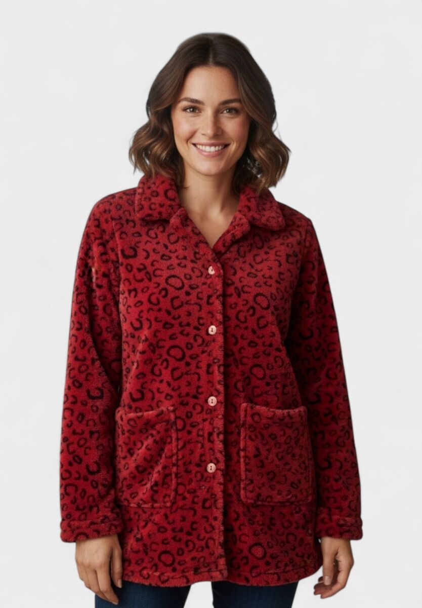 Η γυναικεία ρόμπα fleece Collection Bordo συνδυάζει άνεση, ζεστασιά και στιλ. Σε μπορντό απόχρωση με animal print μοτίβο, είναι ιδανική για τις κρύες μέρες και νύχτες του χειμώνα. Διαθέτει κουμπιά στο μπροστινό μέρος και πρακτικές τσέπες, προσφέροντας κομψότητα και λειτουργικότητα. Κατασκευασμένη από 100% βαμβάκι fleece, αγκαλιάζει απαλά το σώμα, προσφέροντας μοναδική αίσθηση απαλότητας και cozy εμφάνιση στο σπίτι.
