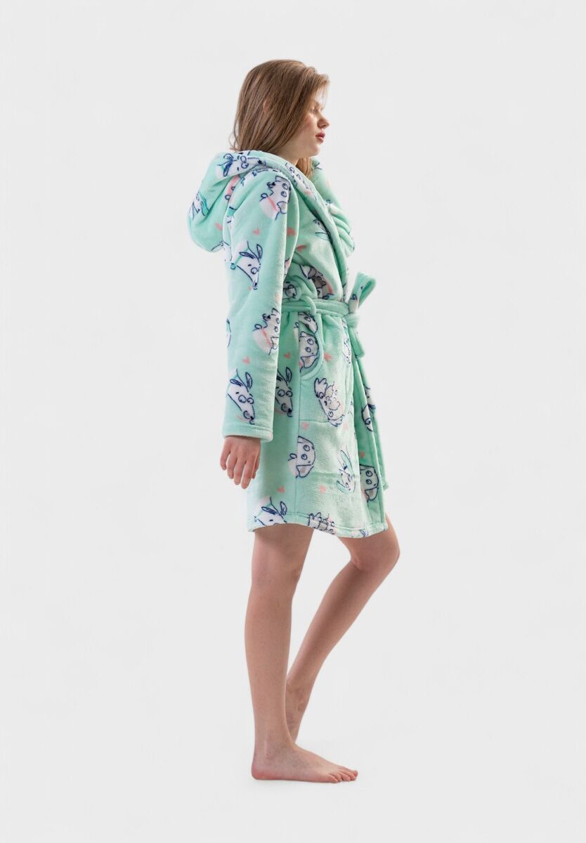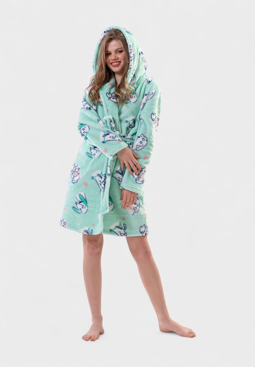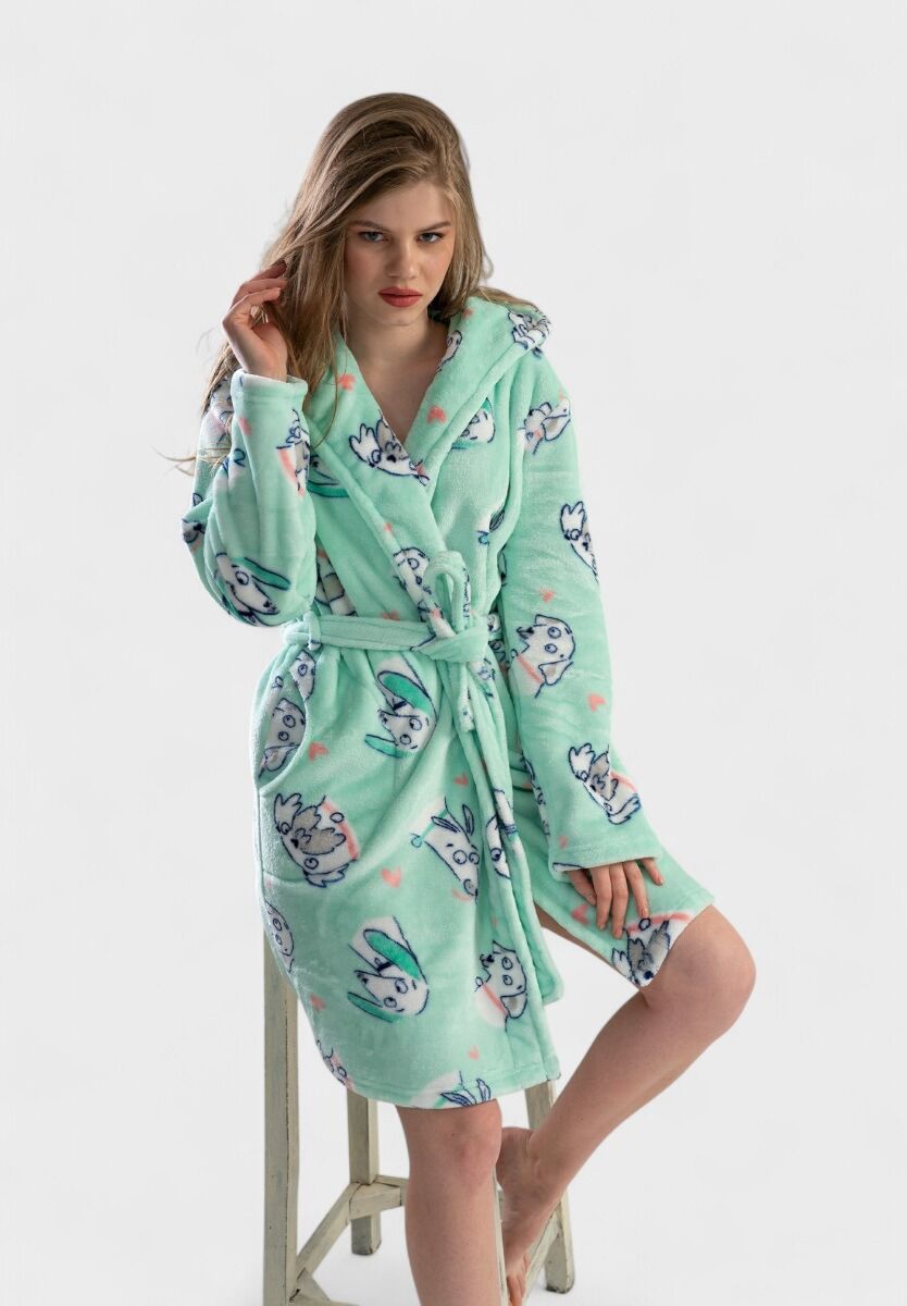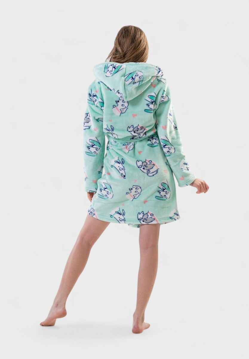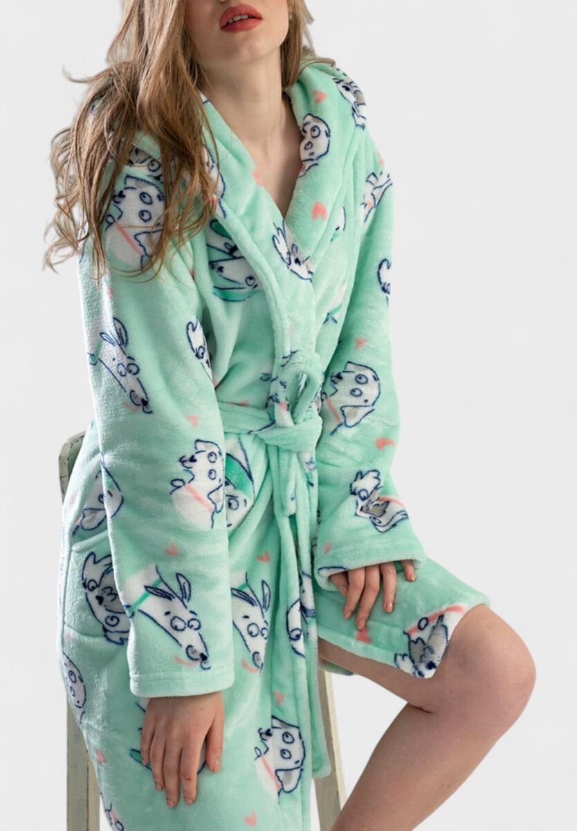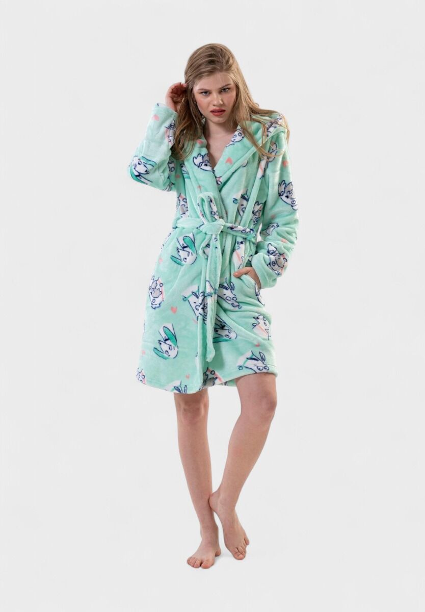 Η γυναικεία ρόμπα Vienetta σε απόχρωση μέντας συνδυάζει τη χαριτωμένη εμφάνιση με την απόλυτη άνεση. Κατασκευασμένη από 100% polyester fleece, προσφέρει απαλή υφή, ιδανική για τις κρύες ημέρες του χειμώνα. Διαθέτει κουκούλα, ζώνη στη μέση για τέλεια εφαρμογή και πρακτικές τσέπες. Το παιχνιδιάρικο σχέδιο με ζωάκια προσθέτει μια διασκεδαστική πινελιά, ιδανική για χαλαρές στιγμές στο σπίτι.
