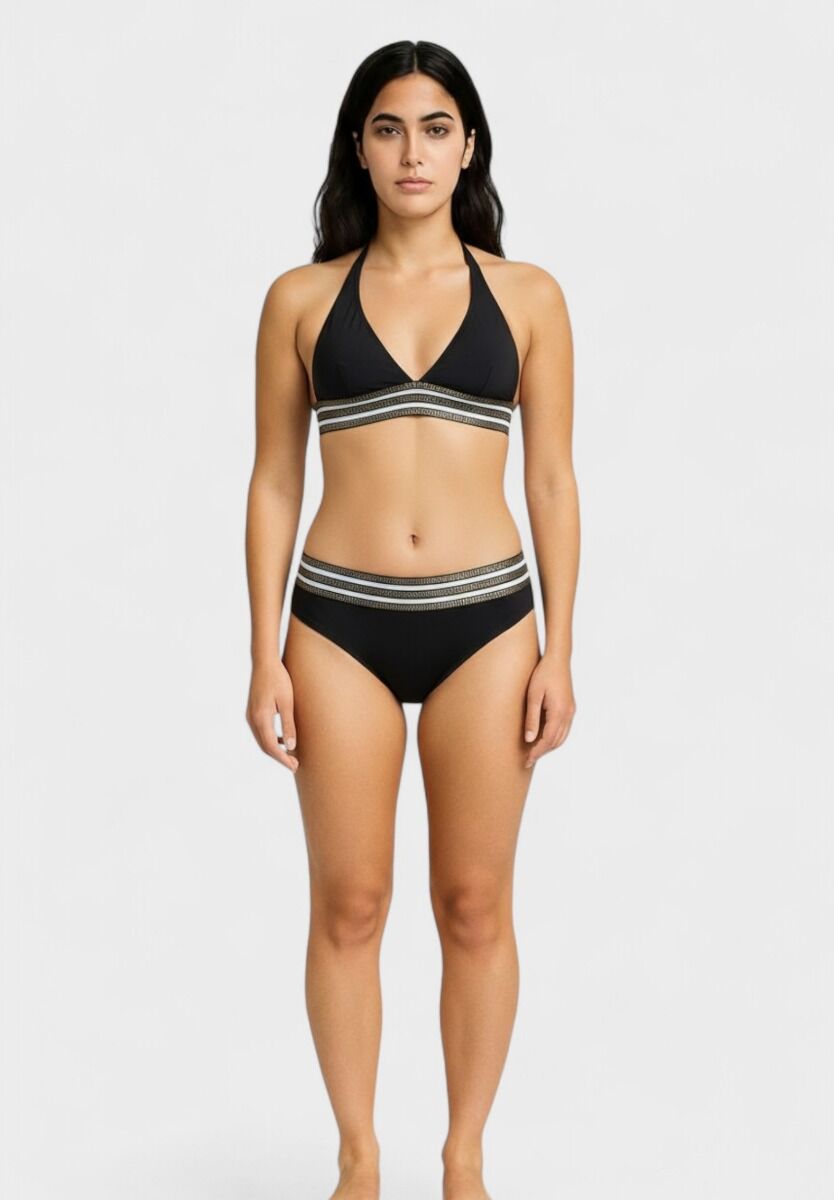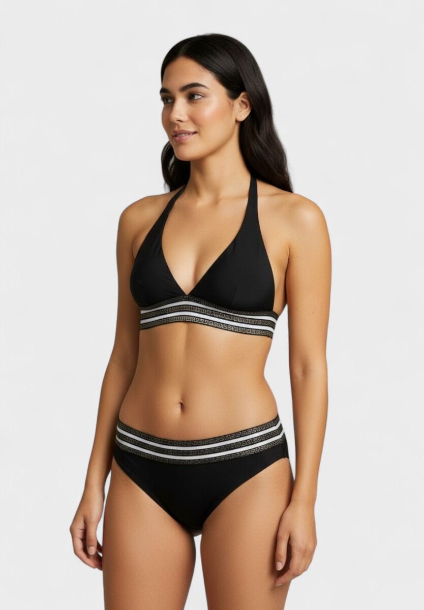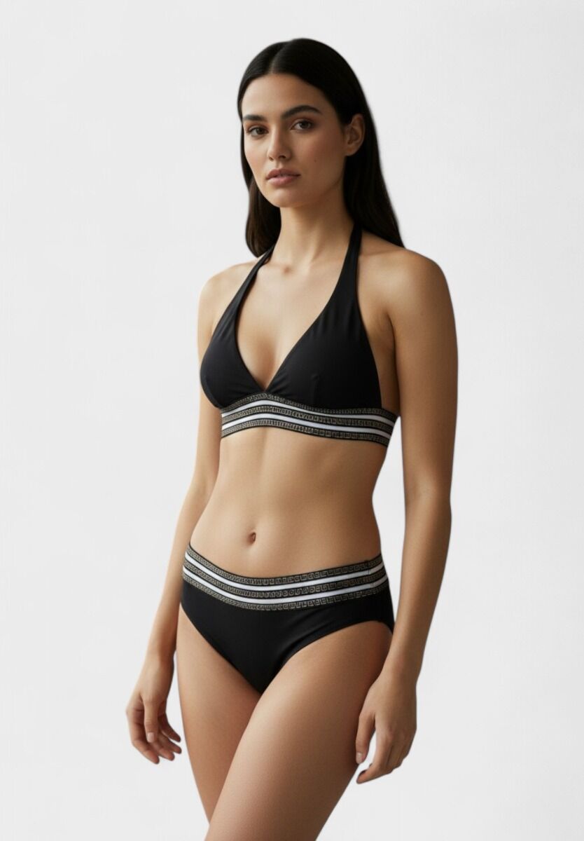 Αναβάθμισε την καλοκαιρινή σου εμφάνιση με αυτό το εντυπωσιακό και κομψό γυναικείο μαγιό δύο τεμαχίων. Ο συνδυασμός πολυτελούς μαύρου χρώματος με χρυσό γεωμετρικό μοτίβο σε λάστιχα τύπου ζώνης χαρίζει δυναμισμό και υψηλή αισθητική στην παραλία ή την πισίνα.