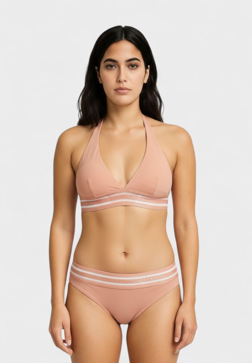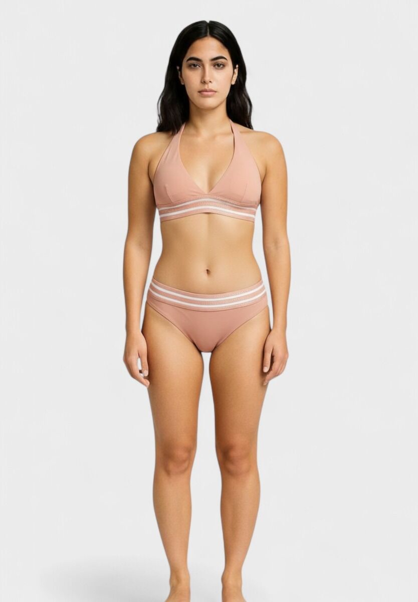 Δώσε χρώμα και κομψότητα στις καλοκαιρινές σου εμφανίσεις με αυτό το ροδακινί γυναικείο μπικίνι, που συνδυάζει minimal αισθητική με διακριτική πολυτέλεια. Οι χρυσές λεπτομέρειες με ελληνικό μοτίβο πάνω στο διπλό λάστιχο τονίζουν τη μέση και προσφέρουν μοναδικό χαρακτήρα.