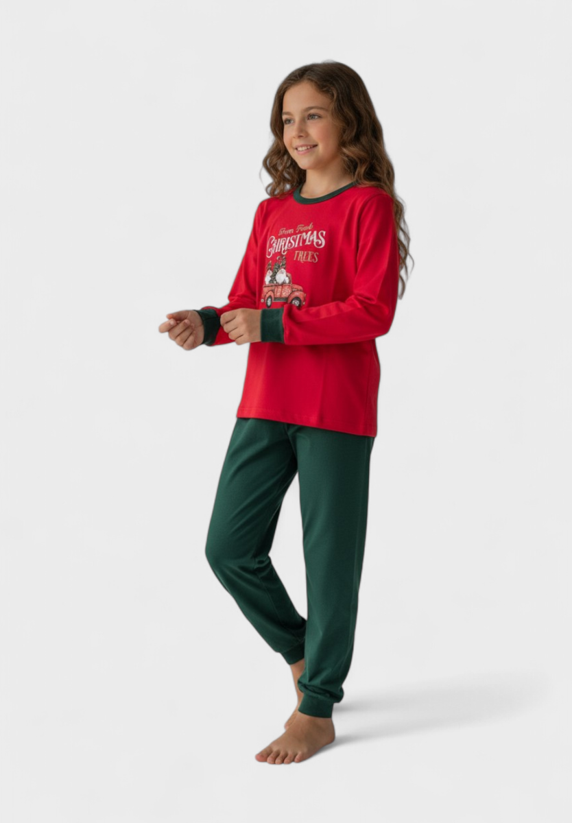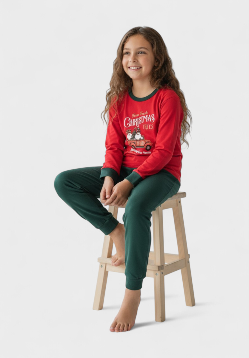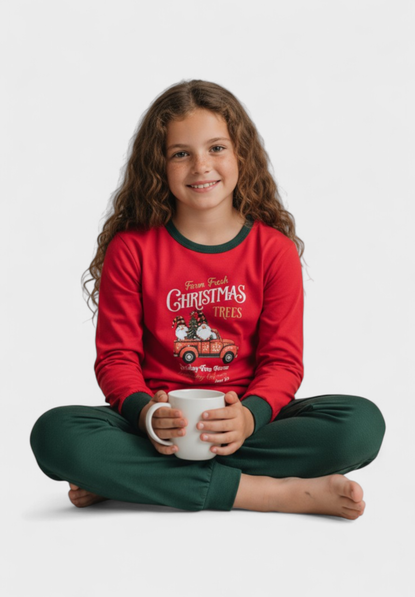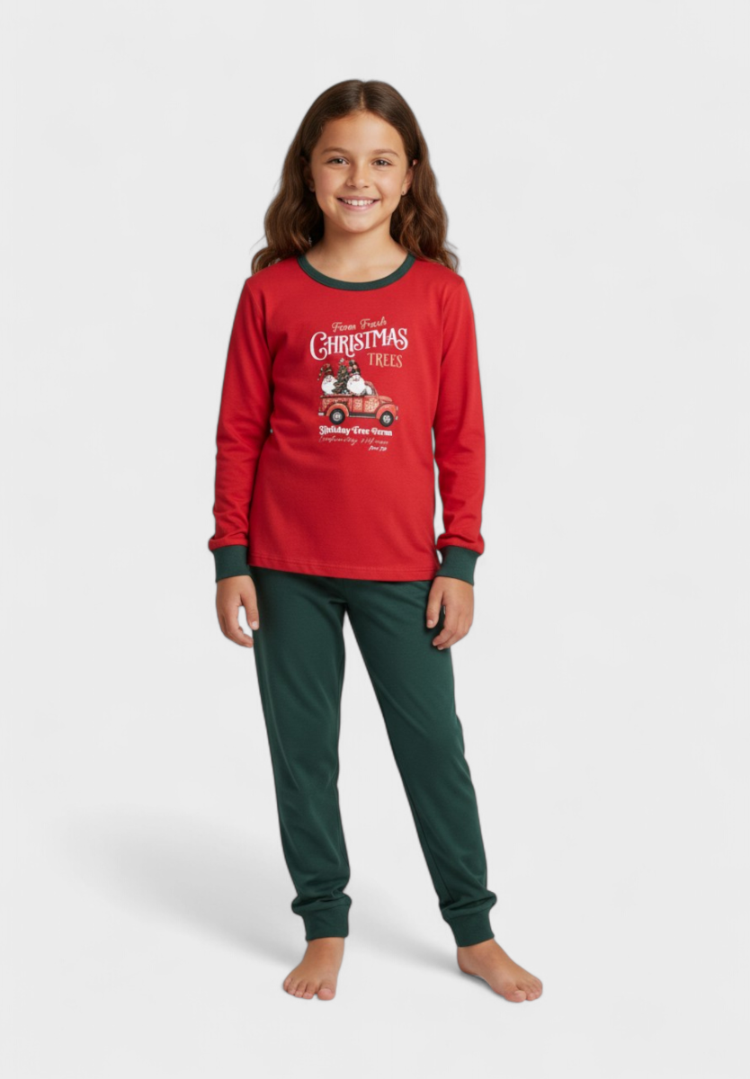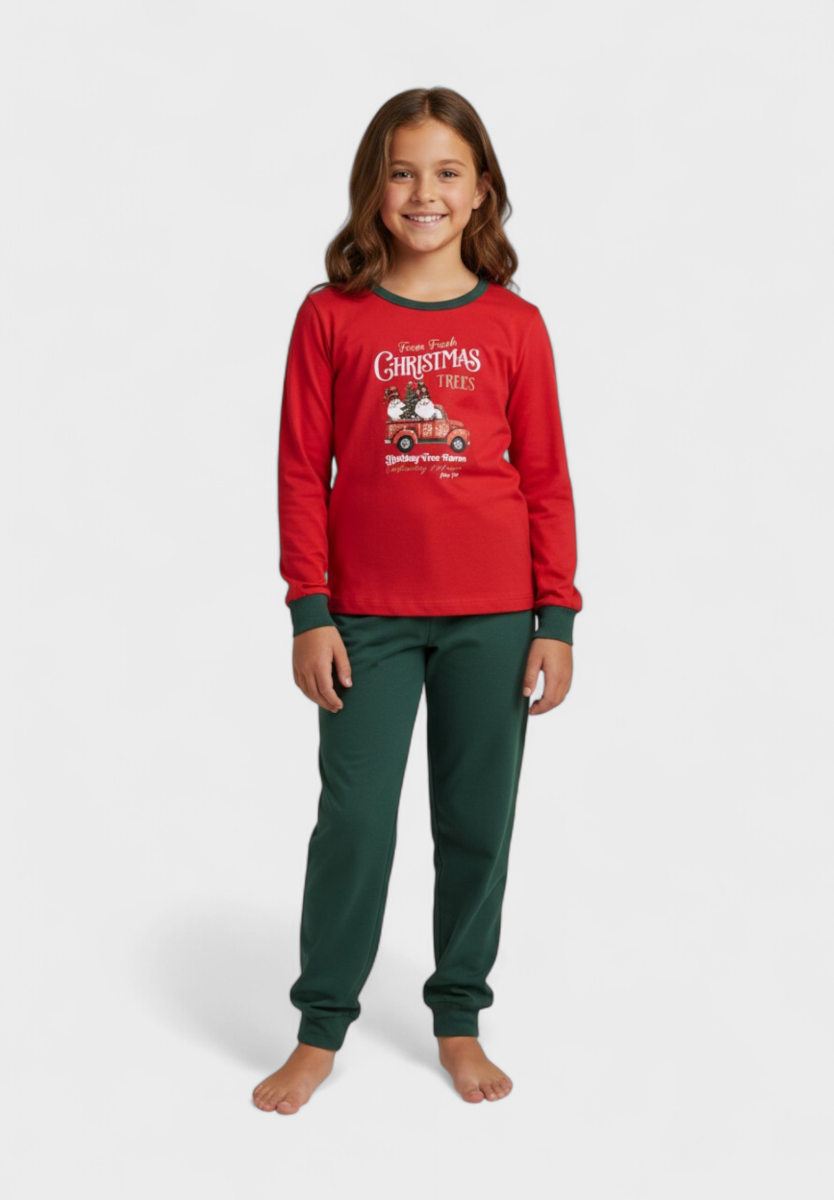 Το σετ αποτελείται από μακρυμάνικο μπλουζάκι με στάμπα “Christmas Trees” και χαριτωμένο σχέδιο με τον Άγιο Βασίλη πάνω σε φορτηγό, συνδυασμένο με πράσινο παντελόνι με λάστιχο στους αστραγάλους.