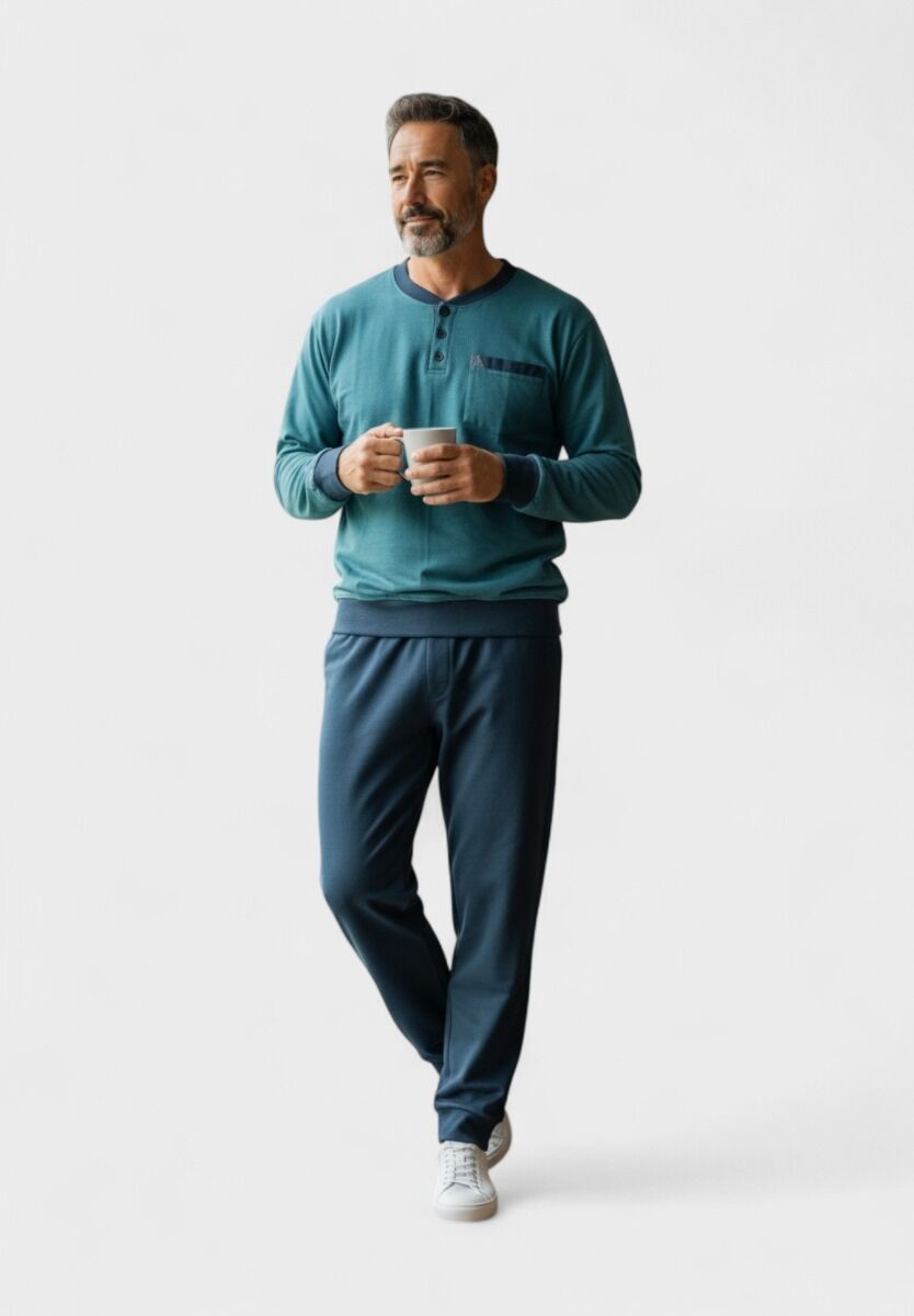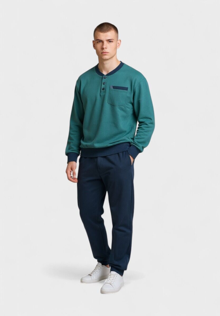 Η ανδρική πιτζάμα Collection Green συνδυάζει άνεση και στυλ για κάθε στιγμή χαλάρωσης. Το επάνω μέρος διαθέτει κουμπιά στο στήθος, ριμπ τελείωμα στα μανίκια και μοντέρνο τσεπάκι με λεπτομέρεια σε κυπαρισσί χρώμα. Το παντελόνι έχει κουμπί για εύκολο άνοιγμα και άψογη εφαρμογή με λάστιχο στη μέση και στα μπατζάκια.