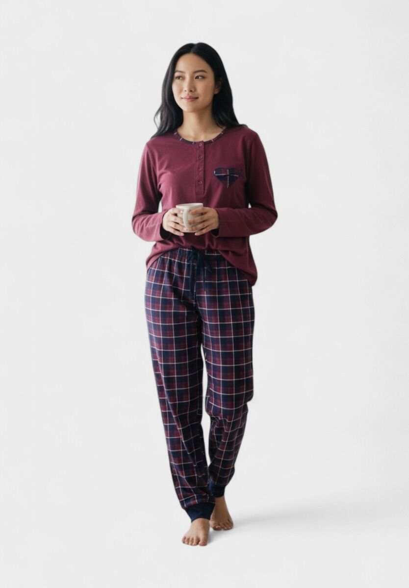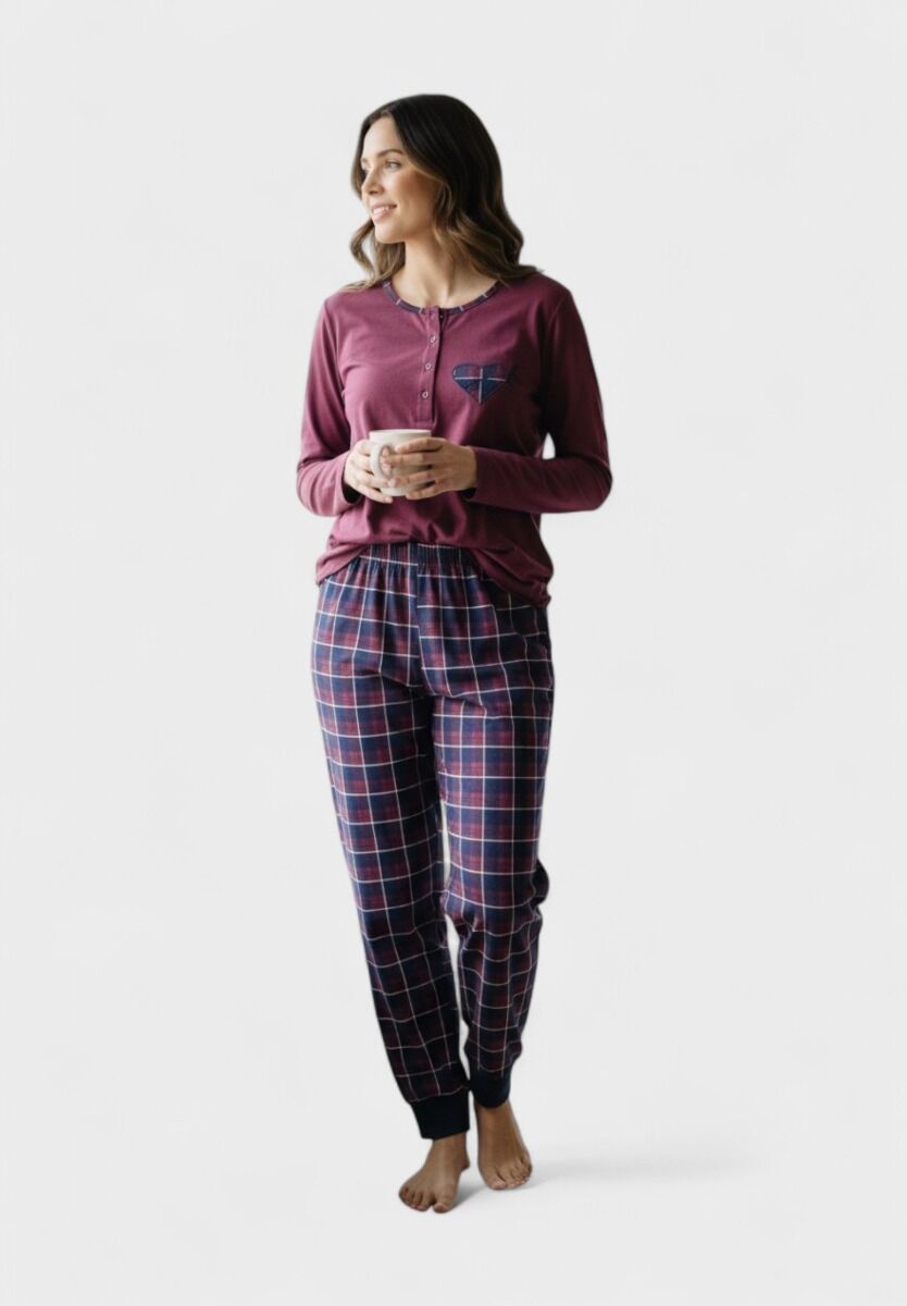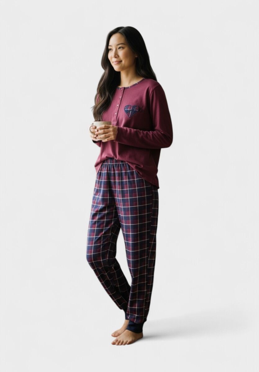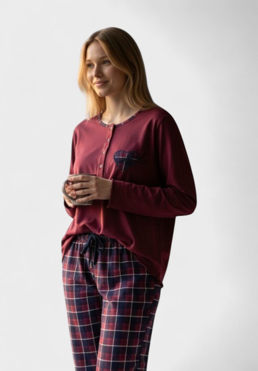 Η γυναικεία πιτζάμα Interlock Collection Autumn Heartbeat συνδυάζει άνεση και στυλ για τις cozy στιγμές στο σπίτι. Το πάνω μέρος σε μπορντό χρώμα διαθέτει κομψό σχέδιο καρδιάς με καρό λεπτομέρειες και κουμπάκια στο ντεκολτέ, ενώ το παντελόνι με καρό μοτίβο σε μπλε και κόκκινες αποχρώσεις προσφέρει ζεστασιά και χαλαρή εφαρμογή. Κατασκευασμένη από 70% βαμβάκι και 30% πολυεστέρα, είναι ιδανική για τις φθινοπωρινές και χειμωνιάτικες νύχτες. Μαλακή, ζεστή και ανθεκτική — για στιγμές απόλυτης χαλάρωσης με στυλ.